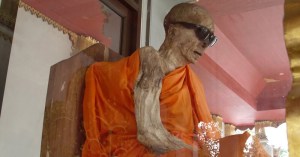 The last days of the monk’s life were spent in a tiny burial chamber just large enough for him to sit in lotus position. The chamber was buried in the ground. A bamboo pole was inserted for air and a bell was rigged to the box. Each day, the monk would ring the bell to signal that he was still alive. When the bell stopped ringing, the bamboo pole was removed and the body sat in the box for another 1000 days.