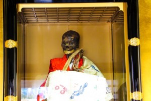 Tetsumonkai mummified himself in 1829 at 71 years old. He sits in state in Churenji. Tetsumonkai’s life is well documented. He was just an ordinary man who killed a samurai and became a monk to protect himself from being arrested. Later, when he visited the city of Edo, he learned that many people in the town had taken ill with an eye disease. He offered up his own left eye by gouging it out as a sacrifice to end the suffering. Before mummifying himself, he was head priest and in charge of the Sokushinbutsu at Honmyōji.