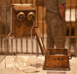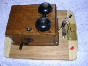 The Tucker Telephone was constructed from parts of a crank telephone. The electric generator inside the phone was wired to 2 batteries.