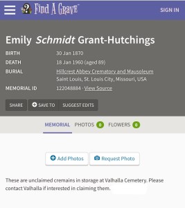 Emily died on January 18, 1960 at the age of 89. She was senile and malnourished at the time of her death. Her cremains were unclaimed and stored in St. Louis, Missouri. The cemetery invited anyone who might want the ashes to contact them.